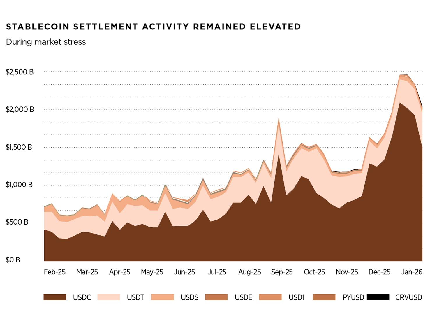 Operationally, stablecoins continued to function as intended. Peg stability was maintained throughout the volatility, and USDT processed over ~$1.9 trillion in transfer volume over the past 30 days, including during peak stress.