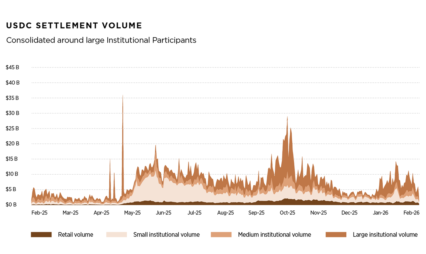 Nearly half of all stablecoin settlement volume during peak stress came from large institutional-sized transfers.