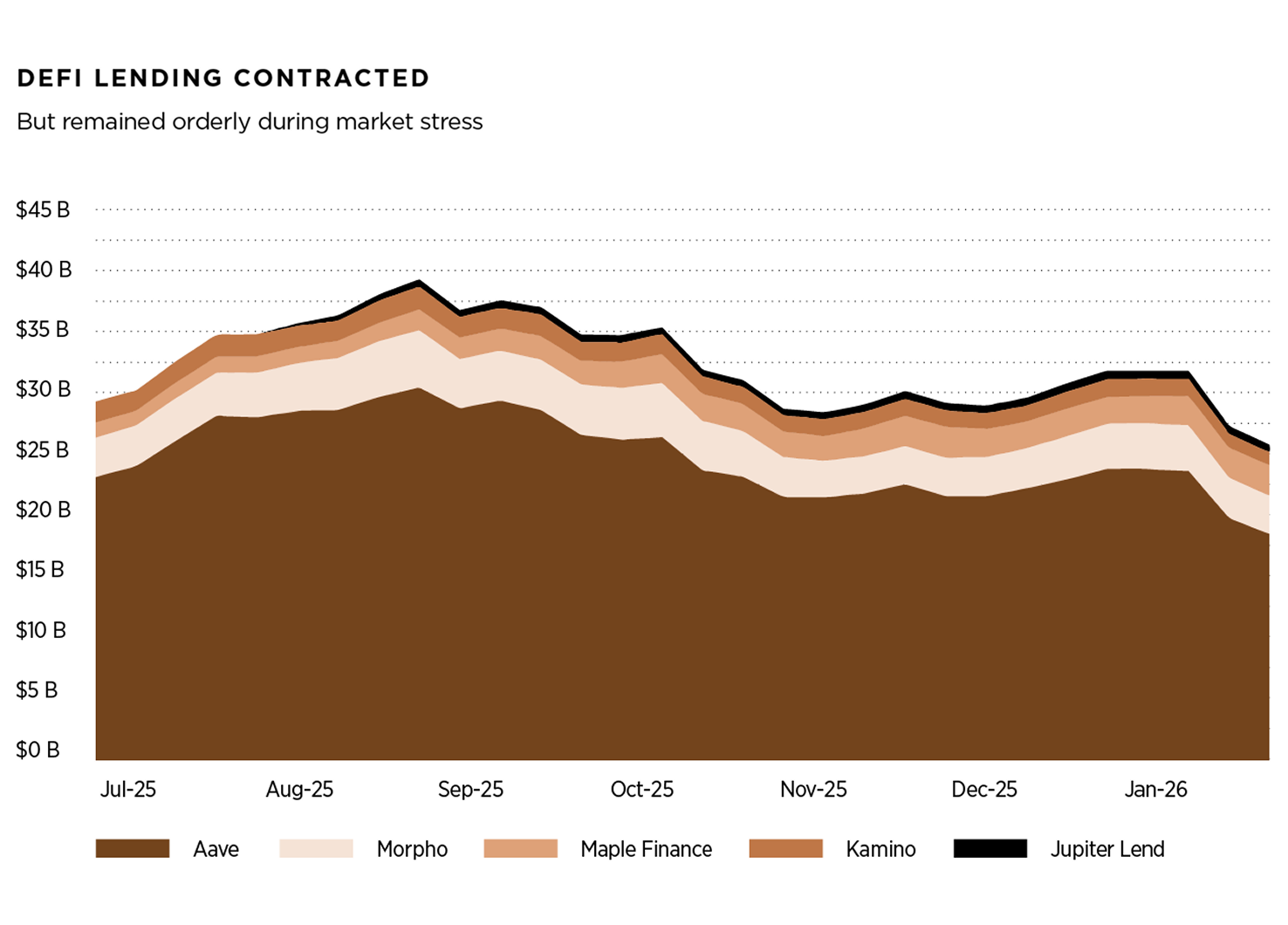 In DeFi lending, outstanding loans declined ~16% (from ~$37 billion to ~$31 billion). Importantly, the pullback was not uniform. The contraction was concentrated in higher-risk venues, while more established platforms demonstrated relative resilience: