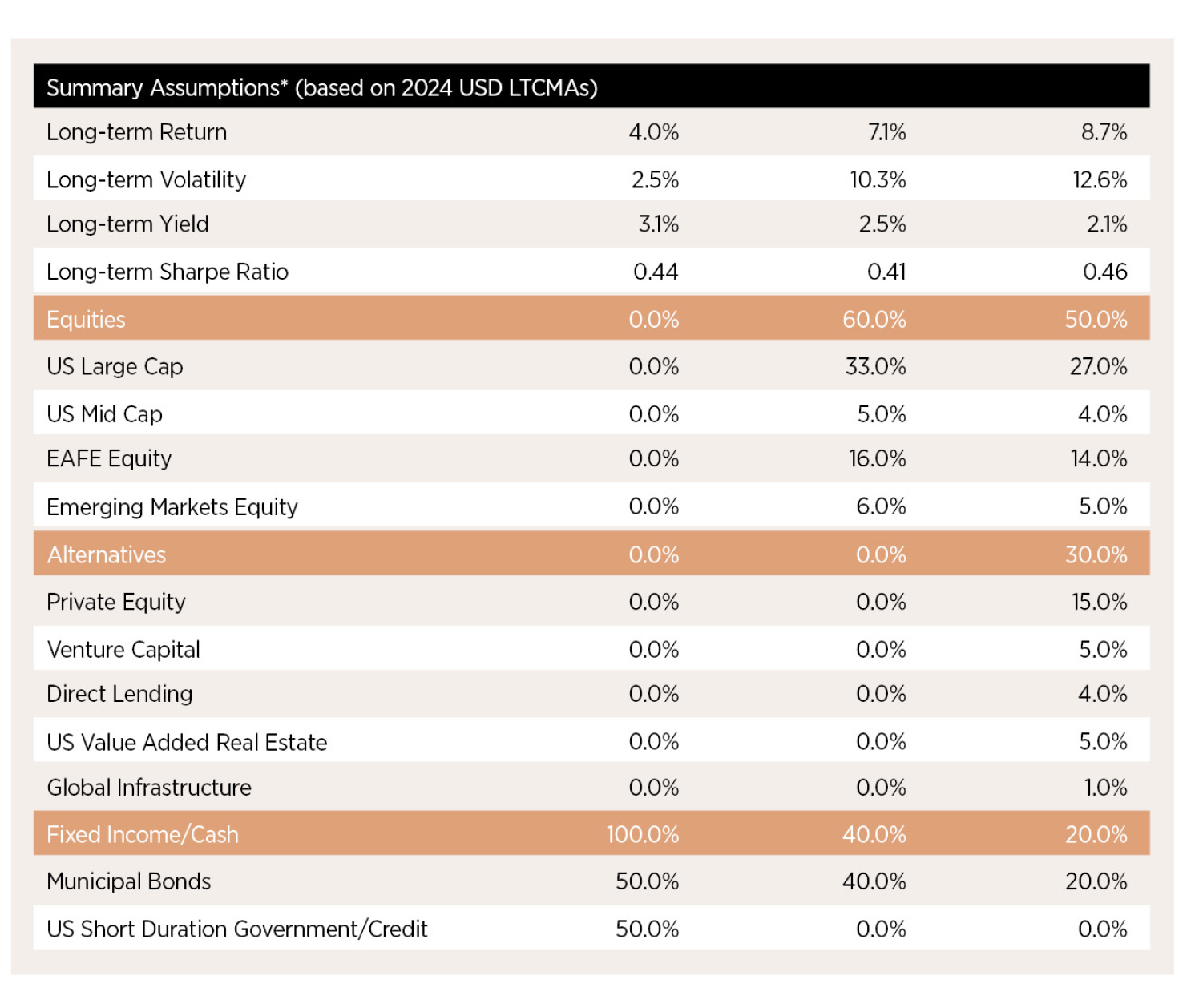 These assumptions can help establish reasonable expectations for risk and return over a longer period of time for various asset classes. This visualizes, on a strategic timeframe, the incremental return achievable through active management and through asset classes that may be in particular focus like fixed income or other diversifying pieces of the portfolio to complement a concentrated asset.