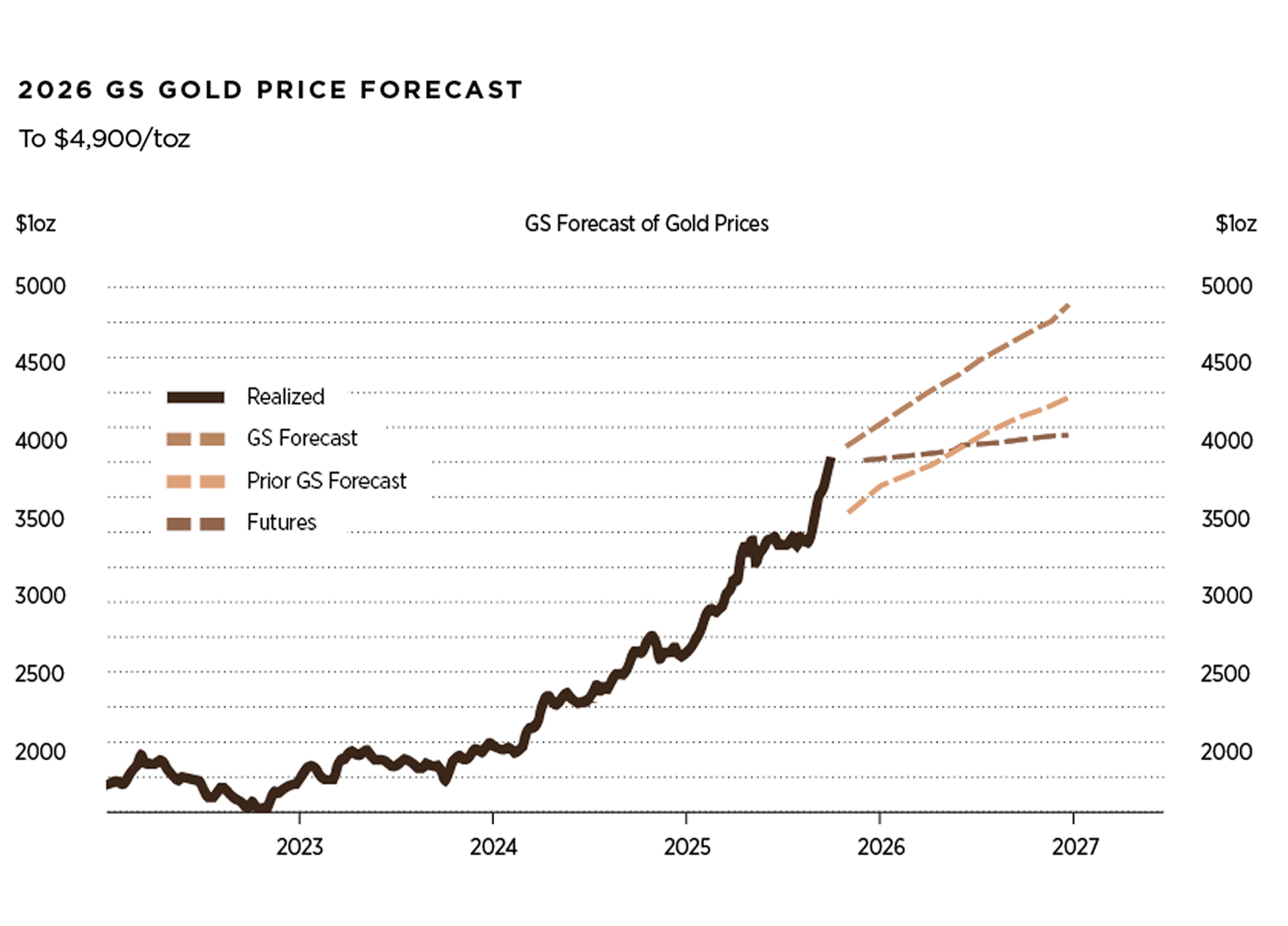According to Goldman Sachs the year-end 2026 gold forecast is USD $4,900 per ounce, supported by stronger-than-expected central bank demand, persistent Western ETF inflows, U.S. dollar debasement and geopolitical uncertainty.