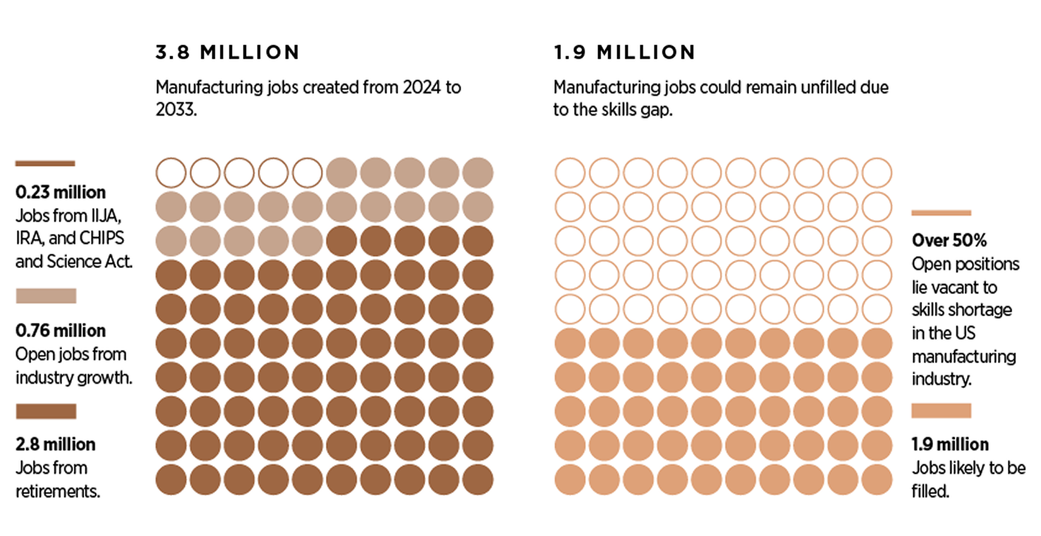In the U.S., as in most of the world, the skilled labor needed to power this shift is rapidly aging out, casualties of ‘the Silver Tsunami’. Nearly one-third of the manufacturing workforce is over 55. The industry will need 3.8 million additional workers by 2033, on top of the more than half a million positions unfilled as of May 2025.