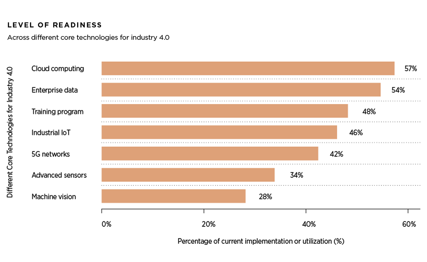 While the lion's share of North American manufacturing does not have a single robot on the factory floor, the level of technology readiness varies drastically. Leaders like Tesla’s Gigafactories or FANUC operate at 90%+ automation, with many large manufacturers like Amazon, Foxconn, and ABB following behind at 70-80%. However, the reality is that the majority of global manufacturers are small- to mid-sized manufacturers who lag on adopting core technologies: cybersecurity protocols, Industrial IoT (IIoT), edge-cloud connectivity, advanced sensor networks, data architecture, and standards.