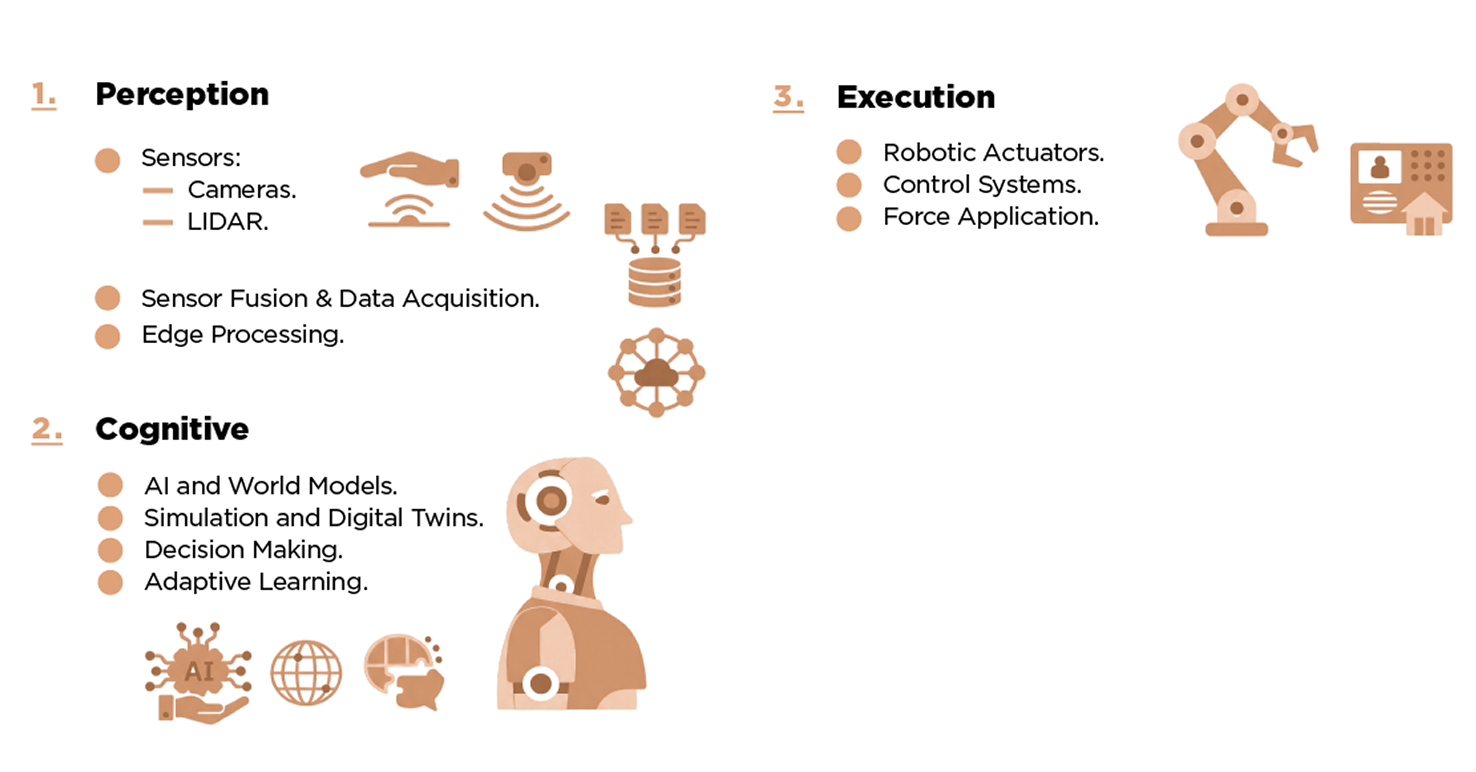 Physical AI combines sensors, intelligent models, and actuators into a closed-loop system that can perceive, reason, and act in real-world environments. If traditional AI is like a brilliant advisor who’s never touched a tool, Physical AI is like a master craftsman who can see, understand, and adapt in real time. What differentiates this from traditional LLMs or AI capabilities is the foundation of its intelligence. Physical AI is grounded and trained in real-world physics, spatial reasoning, and probabilistic logic, rather than linguistic or abstract reasoning. The algorithms understand real phenomena and, therefore, are able to unlock a new level of autonomy. Physical AI connects raw sensor data, codebase, orchestration layer, and robotic hardware to build out the automation value chain below. As a Citigroup report put it, “AI is a huge upgrade to robotics,” allowing robots to see, move, talk, learn, and act.