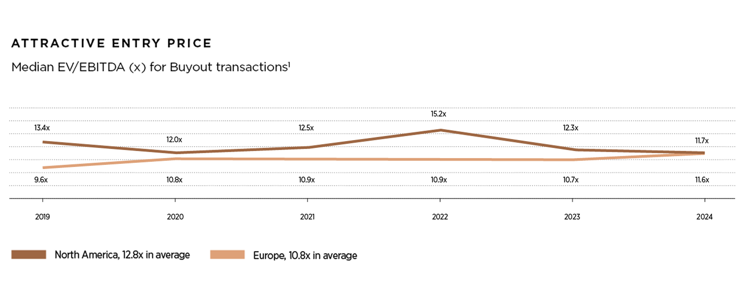 Unlike the highly mature and saturated US market, where mega-funds crowd the mid-market, Europe’s fragmentation and less developed private equity ecosystem means less competition for deals, and average purchase multiples in Europe reflect this. Since 2019, purchase multiples have been two turns lower on average compared to the US, meaning not only can managers purchase quality companies at a discount relative to the US, but they can also develop these companies and then sell them to US managers at a premium.