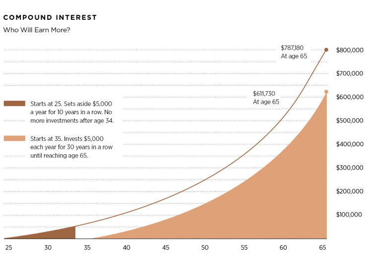 If Sheila sets aside $5,000 a year for 10 years in a row starting at age 25 and makes no additional contributions after age 34, at an 8% interest rate compounded annually, she will have $787,180 at age 65. If Jack starts the same process at age 35 and contributes $5,000 each year until reaching 65, he will only have $611,730. This example shows how Sheila takes advantage of compound interest allowing more time for the money to grow.
