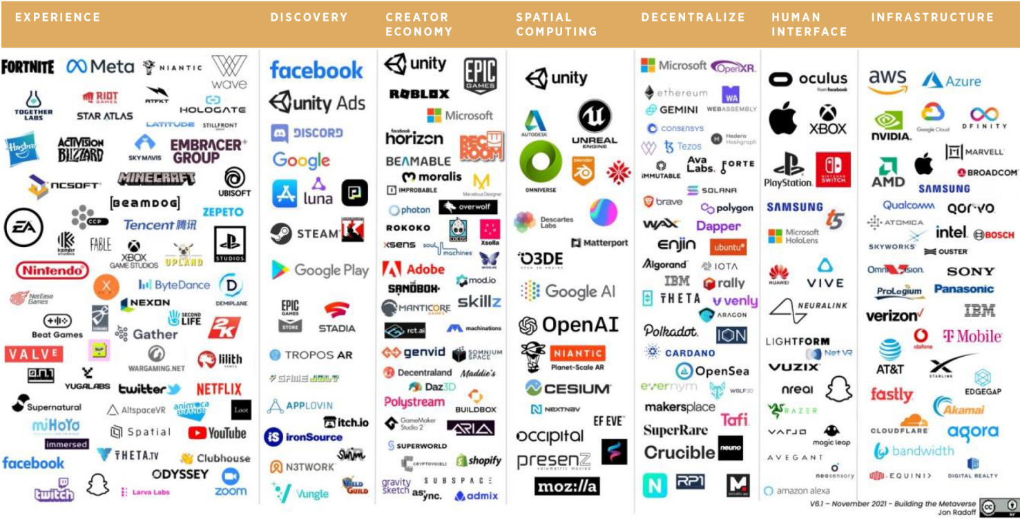 Jon Radoff, CEO of Beamable, a Live Game Services platform, is another prominent industry commentator on the topic of the metaverse and is widely quoted by various articles associated with the concept. His prior work has focussed on online communities, intemet media and computer games. Jon sees the metaverse as composed of seven layers: