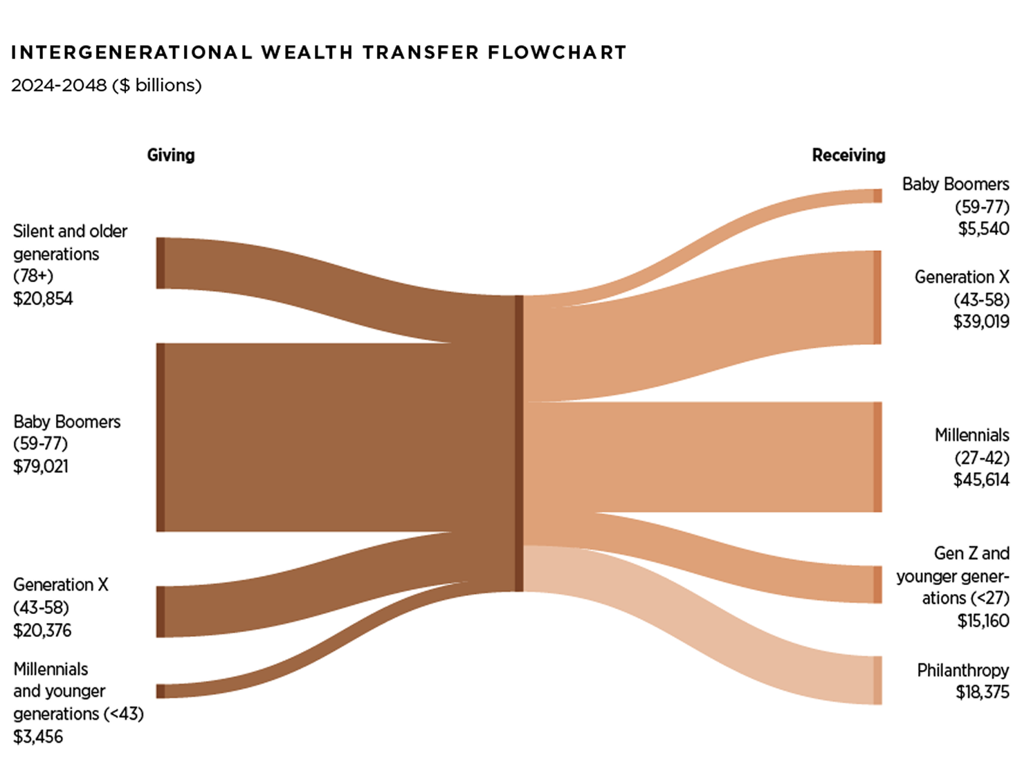 At the same time, Cerulli projects that $124 trillion will change hands through 2048, with $105 trillion flowing to heirs and $18 trillion allocated to philanthropy. Nearly $100 trillion will be transferred from Baby Boomers and older generations, accounting for 81% of all wealth transfers. The chart, included later in this article, visually highlights how these funds are expected to be distributed across generations and charitable giving.