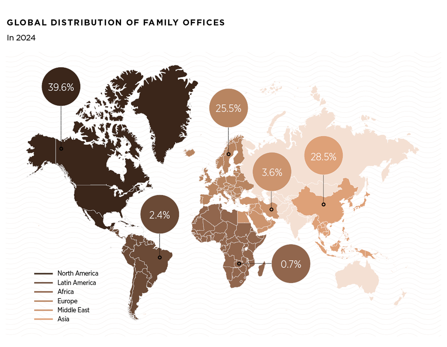 Family Offices are no longer concentrated in just a handful of financial hubs. The global distribution of Family Offices shows North America leading at 39.6%, followed by Asia (28.5%) and Europe (25.5%). Latin America (2.4%) and Africa (0.7%) remain underrepresented but show growth potential.