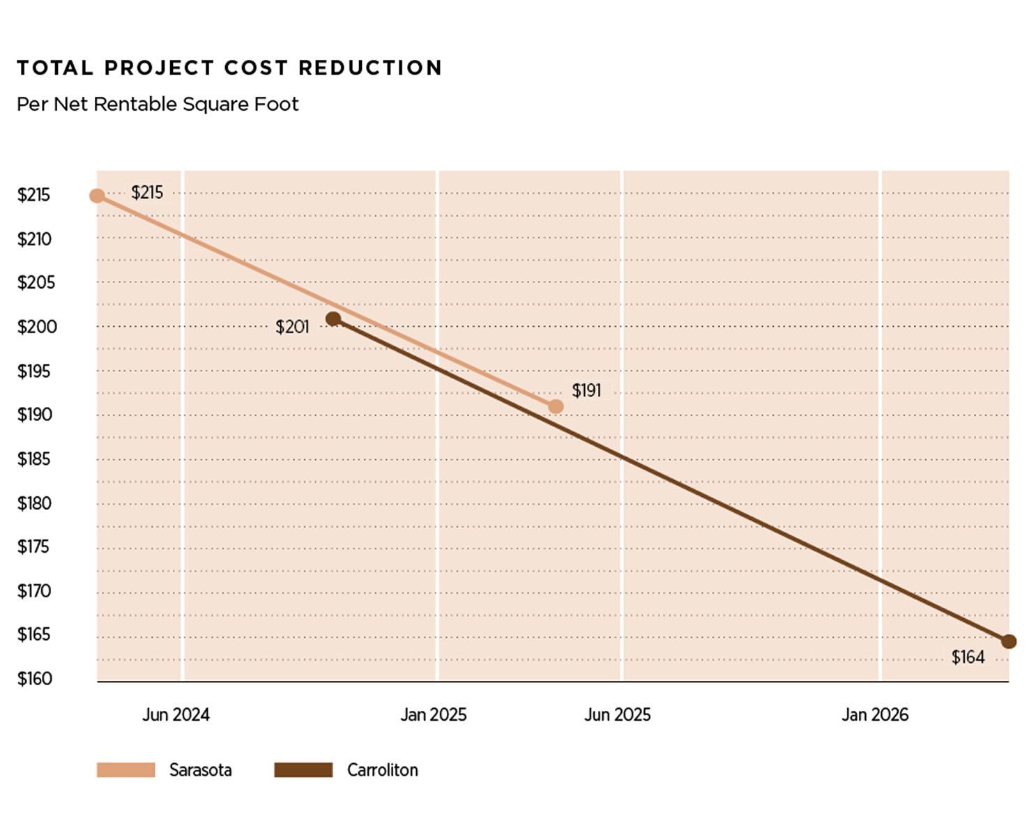 We can take advantage of reduced construction pricing. While not every location is experiencing decreases in construction pricing, none of the markets DXD is currently developing in are experiencing construction price increases. Most notably, Florida and Texas have seen the most competitive construction bids, as evidenced by the following DXD investments in those locations:
