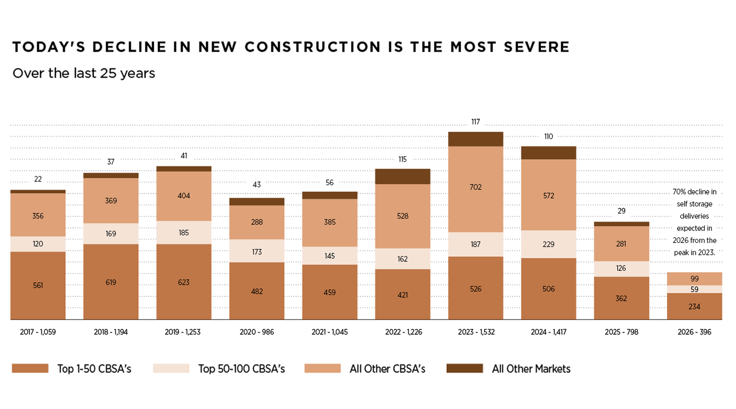 Self storage is particularly vulnerable to oversupply, meaning that new construction typically dictates market performance. Market factors such as high interest rates, pullback in bank lending, and sidelined equity have driven a historic decline in new construction of self storage.
